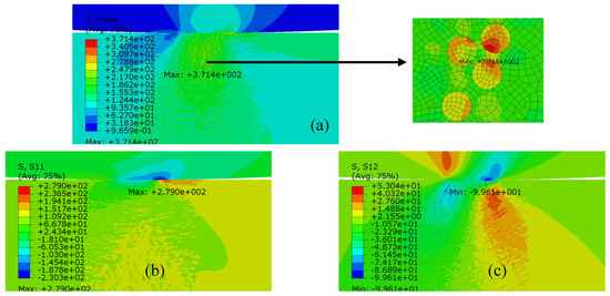 There are many experimental studies [48,55,68,69] and numerical studies [63] on the fatigue problem of heterogeneous materials. However, limited numerical research on fretting fatigue of heterogeneous materials is available [14]. Therefore, the first part of our research is to study the cases with random distribution inclusions. In real metal materials, inclusions and defects are common and randomly distributed. In the fretting fatigue problem of homogeneous materials, the peak of shear stress appears between the stick zone and the slip zone, as shown in Figure 10b. The peak tensile stress and peak von-Mises stress in the whole specimen appears near the edge of contact [8]. From experimental materials and loading conditions, the point of occurrence of von-Mises stress and tensile stress peaks was observed at x = 0.47 mm, the shear stress peak occurred at x = 0.21 mm on the contact surface. But for the heterogeneous materials with randomly distributed inclusions (Table 2), significant stress concentration inside the specimen is observed, as shown in Figure 12. It is the stress distribution below the contact surface of the specimen. It can be seen, from comparison between Figure 10b and Figure 12c, that the shear stress peak is transferred from the contact surface to the inside of the specimen in the heterogeneous situation. It also showed that there may be multiple high stress concentration points inside the structure, hereby forming an influencing group of intrusions, eventually causing multiple fatigue cracking points inside the material as observed in the experiment [55].