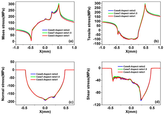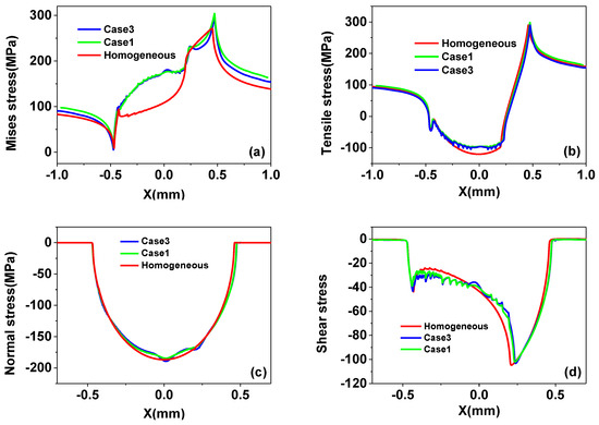 As we can see in Figure 16a, in both of homogenous and heterogeneous specimens, the von-Mises stress peak is near the contact edge, and it changes very sharply near the edge of the contact. The presence of inclusions makes the peak of the von-Mises stress increase significantly, and Al2CuMg has a more obvious effect than Al2O3. This means that in the heavy load condition, the presence of inclusions may accelerate the distortion of the contact edge of the fretting fatigue contact member. The effect of inclusion on the surface tensile stress is not obvious. However, the inclusion will affect the normal and shear stresses.