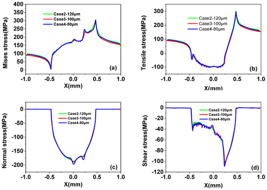 (a) Mises stress, (b) tensile stress, (c) normal stress, (d) shear stress distribution on the contact surface for different distance cases.