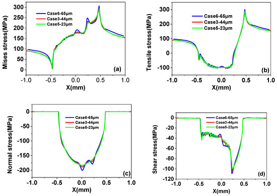 (a) Mises stress, (b) tensile stress, (c) normal stress, (d) shear stress distribution on the contact surface for different inclusion size cases.