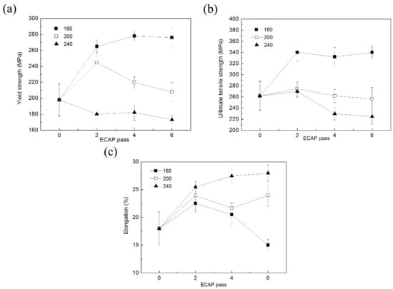 The strengths of the Mg-6Zn alloy did no constantly increase by improving plastic deformation. Both yield strength and ultimate tensile strength were remarkably improved after two passes of ECAP at 160 °C; however, the strengths were nearly unchanged with further plastic deformation (i.e., four passes and six passes of ECAP processing, as shown in Figure 1b,c). When ECAP processing was performed at 200 °C and 240 °C, the strengths decreased with increasing numbers of ECAP passes. The elongation of the samples significantly increased after two passes of ECAP at each temperature; however, it decreased with further plastic deformation at 160 °C but slightly fluctuated at 200 °C and increased a little at 240 °C.
