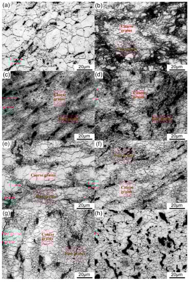The experimental results indicated that the fine grains of the bi-modal grain structure mixed with a significant amount of fine precipitates distributed near the eutectic structure. Since a number of precipitates produced in the process of ECAP depend on the solute concentration in the local region and deformation temperature, which determined the saturated solubility of zinc and precipitation nucleation rate. The precipitates chiefly concentrated near the eutectic structure, which was also the zinc-rich region, or the supersaturated solid solution. In addition, these fine particles acted as strong obstacles to the dislocation movement and increased the dislocation density in the subsequent deformation process. Conversely, the dislocations and grain boundary could be not only the nucleation sites for the secondary phase but also for the diffusion channels for solute atoms during precipitation. The fine grains among the bi-modal grain structure formed and remained stable under the combination of dynamic recrystallization and the pinning effect of the fine precipitates on grain boundary. However, the coarse grains primarily formed in the zinc-poor region away from the eutectic structure due to the absence of precipitates. In a previous study, the bi-modal or multi-modal grain structure in the single-phase microstructure was due to the dynamic recrystallization under inhomogeneous deformation, which could transform into a homogeneous grain structure with increasing strain [,]. In this work, the inhomogeneous grain structure remained after six passes ECAP at 160 °C and 200 °C, as shown in Figure 2d and Figure 2g, respectively. However, there was no appearance of a bi-modal grain structure in the microstructure of the sample processed at 240 °C, as shown in Figure 2j. Thus, unlike the single-phase microstructure, the essential reason for the formation of the bi-modal grain structure containing fine precipitation with inhomogeneous precipitate distribution was further attributed to the inhomogeneous distribution of the solute.
