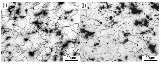 Figure 2 shows the optical micrographs of the experimental Mg-6Zn alloy, in which the dark contrast phase represents intermetallics. The microstructure of the as-extruded alloy consisted of equiaxed grains with a size of ~15 μm and bulk eutectic structure distributed along the grain boundaries. Significant grain refinement and bi-modal grain structure (i.e., comprised of coarse grains and fine grains) were obtained after ECAP for two passes at 160 °C, as shown in Figure 2b. A heterogenous grain structure was usually produced under the condition of smaller deformation [,]. When ECAP passes were gradually increased up to six, the average grain size of the larger grains were ~4 μm and the grain size of the smaller grains mixed with intermetallic particles was ~1 μm, as shown in Figure 2c,d. The grain size of the alloy processed by the same ECAP pass increased with increasing ECAP temperature. At 200 °C, the bi-modal grain structure was also observed until the ECAP passes reached six, as shown in Figure 2e–g. The bi-modal grain structure disappeared when the ECAP temperature was elevated to 240 °C. After two passes of ECAP, the microstructure was no more refined but coarsened with increasing numbers of ECAP passes and the average grain size was ~7 μm after six passes, as shown in Figure 2h–j.
