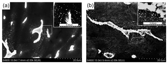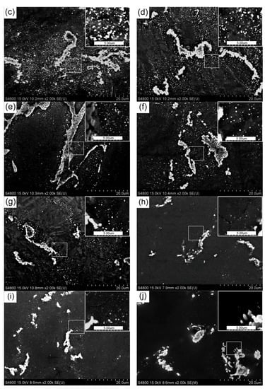 Figure 3 shows the SEM micrographs of the samples before and after the ECAP process. There were two phenomena that changed the appearance of the intermetallics: fragmentation and solution of the bulk eutectic structure, and the desolution of fine precipitation particles. In general, the appearance of the intermetallics was controlled by the deformation amount and pressing temperature during ECAP processing. In the microstructure of as-extruded Mg-6Zn alloy, there were some bulk eutectic structure and a significant amount of fine particles around the eutectic structure, as shown in Figure 3a. At 160 °C, the ECAP processing not only caused eutectic deformation, distortion, and elongation, but also induced the precipitation of massive fine particles, as shown in Figure 3b–d. However, when ECAP was performed at the higher temperature of 200 °C, because of the improvement in zinc solubility, the amount of both broken eutectics and precipitates decreased, compared with that of ECAP at 160 °C, as show in Figure 3e–g. When processed at 240 °C, with an increasing number of ECAP passes, these fine precipitates disappeared completely except for the small amount of dissolved broken eutectics. Through observing the enlarged area in the SEM image, we found the edge of these residue dispersive intermetallics were smooth, likely due to the dissolution of broken eutectic during ECAP, as shown in Figure 3h–j.