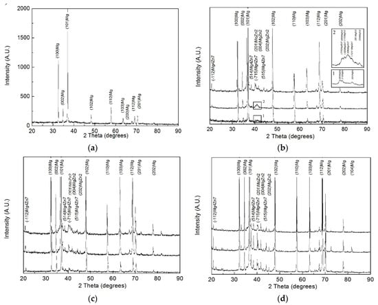 X-ray diffraction (XRD) patterns of Mg-6Zn: (a) as-extruded, and ECAP at (b) 160 °C, (c) 200 °C, and (d) 240 °C.