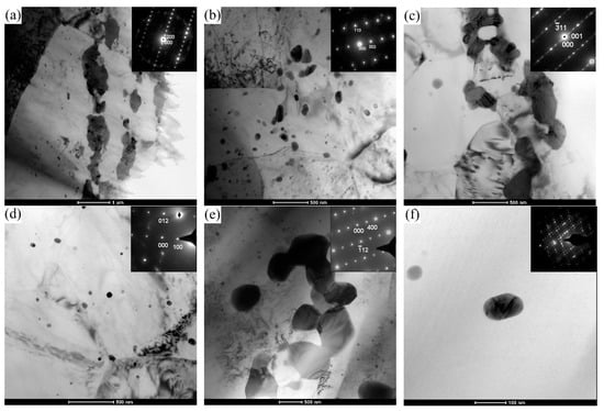 The SEM observations and XRD results suggested that ECAP induced the precipitation of Mg4Zn7 and MgZn2. To further study the precipitation behavior of Mg-6Zn alloy during ECAP, TEM, and selected area electron diffraction (SAED) were used to determinate the morphology and structure of the intermetallics. After ECAP processing for six passes at 160 °C, the aggregation of irregularly shaped particles with diameter of 0.5–1 μm was transformed from the broken eutectic structure, around which a large number of fine particles was distributed, as shown in Figure 5a. These fine particles were spherical or ellipsoid in shape and from 10 to 100 nanometers in diameter, as shown in Figure 5b. The irregularly-shaped particles were identified as Mg4Zn7 phase and the finer particles were identified as MgZn2 by indexing the SAED pattern. These fine particles, varying in size, were located in grains and along grain boundaries. When processed for six passes at 200 °C, the assembled larger particles became regular and smooth in shape, which were also indexed as the Mg4Zn7 phase by SAED, as shown in Figure 5c. By contrast, the concentration of fine particles distributed in the matrix decreased, as shown in Figure 5d. After six passes of ECAP at 240 °C, the larger Mg4Zn7 particles eventually became spherical, as shown in Figure 5e, whereas the finer MgZn2 particles became increasingly sparse, as shown in Figure 5f. The Mg4Zn7 particles were 0.5–1 μm in diameter and MgZn2 particles were about 100 nm.