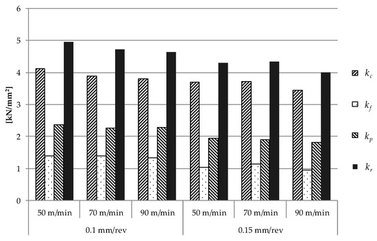 - All of the components of the specific cutting force decreased with the cutting speed due to the thermal softening of the workpiece material. For feeds of 0.1 mm/rev and 0.15 mm/rev, decrements of 8% and 7% were found for the specific cutting force (kc), respectively, when the cutting speed increased from 50 m/min to 90 m/min. This effect was diminished in the rest of the specific cutting force components.