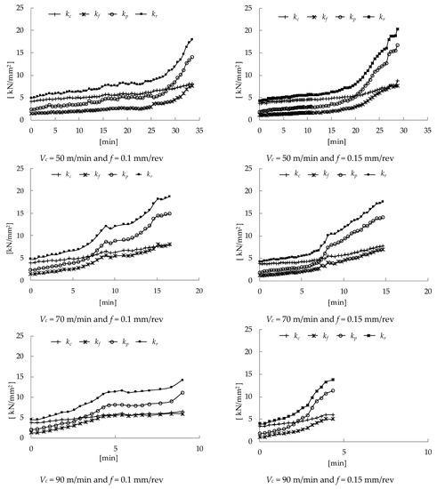 - In general, the effect of the feed on the evolution of specific cutting force components during the tests was not significant.