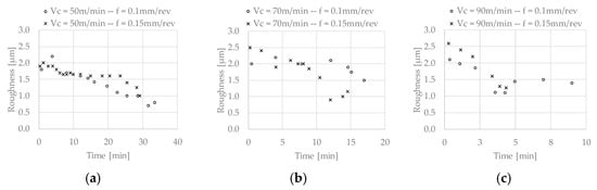 - For all of the tested conditions, when the tools were without significant wear, values of Ra between 1.8–2.6 µm were obtained. Wear progression led to lower values of Ra (between 0.7–1.5 µm) because of the increased effective tool tip radius, which is related to the decrease of Ra values. The best surface quality in terms of the obtained roughness was obtained with the lowest value of cutting speed (50 m/min), while the feed had a negligible effect on this variable.