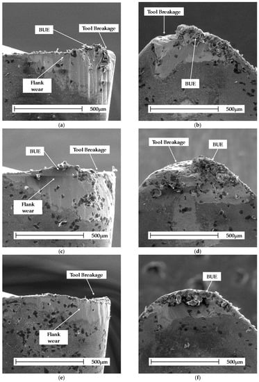 Regardless of the cutting conditions, material adhesion was observed on all of the surfaces of the tool, along with the formation of BUE. However, this phenomenon was not dominant in terms of the cutting-edge life (see Figure 4 with the relief and rake surface views for different cutting conditions).