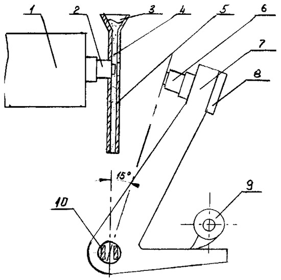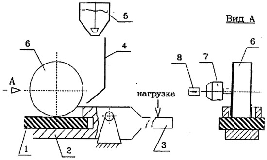 As seen in Figure 1a, the testing machine used to study impact-abrasion resistance consisted of a sample holder (1) and a weight holder (2), which WERE used to control the impact velocity when sample (1) hit the wear bushing (3) of the anvil (4) with an inaccuracy not exceeding 2.5%. It also included a unit with changeable torsion bars (5), which limited the inaccuracy of the created impact energy to 2.5% at the minimum torsion angle of 15°, and a striker (6) with a given directional moment of inertia. A cam (7) created a given slope of the striker.
