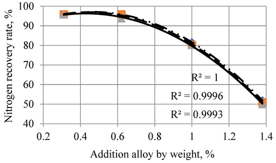 As part of the experimental study, the amount of the ferroalloy introduced in the melt was increased from 0.3 to 1.4% by weight. This was accompanied with a reduction in the nitrogen recovery rate from 95 to 50% (Figure 3), irrespective of the cooling rate. The resultant castings were found to have the same nitrogen concentration, between 0.023% and 0.062%, even though the cooling regimes differed.