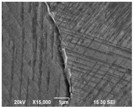 As Figure 6, Areas 1 and 2, demonstrate, microstructures can have layers where either the deformation twin boundaries change their orientation or the spacing changes between the boundaries. Whereas the surface layers, i.e., the layers that come in direct contact with the abradant, form fine grain structures (Figure 6 and Figure 8). The grain (block, fragment, and subgrain) size typically do not exceed 1 μm, although the grain size may change from 50 to 270 µm, depending on the solidification rate.