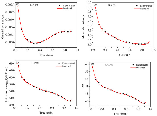 - The relationship between material constants (α, Q, n, and lnA) and true strain in the Arrhenius-type constitutive equation is established by a sixth-order polynomial. The predicted flow stress values of the constitutive equations are in good agreement with the experimental values, indicating that the constitutive equation can accurately estimate the flow stress of H13-mod steel.