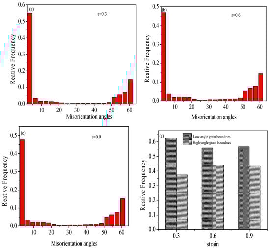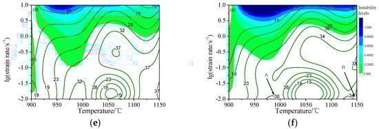 - The processing maps under different strains were established. The instability region mostly corresponded to high-strain-rate conditions; however, the microstructure did not show any signs of instability at high temperatures and high strain rates. By studying the thermal compression test under different deformation amounts, we determined that the processing temperature is 998–1026 °C and 1140–1150 °C and the strain rate is 0.01–0.02 s−1 and 0.01–0.057 s−1. Moreover, the true strain does not exceed 0.6.