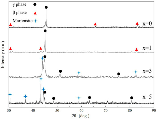 - The microstructure of the shows appeared typical dual-phase structure with Gd doping. The sample with less Gd doping content (x = 0 or x = 1) exhibits γ phase and β phase. Whereas, with the Gd doping of 3 and 5 at.%, the microstructure of the sample consists of a γ phase and martensite structure.