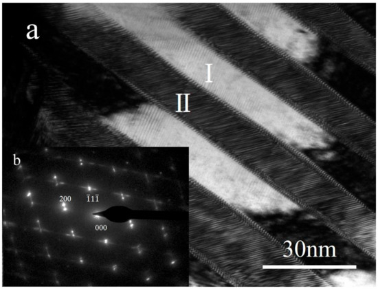 In order to further confirms the structure of martensite, TEM micrographs and selected area diffraction patterns (SADPs) of martensite of the sample with 3 at.% Gd doping (x = 3) in Figure 2 are analyzed. It can be seen that the morphology of martensite consists of uniform black and white stripes alternatively and parallel to each other at approximately 45°, indicating that the martensite possesses a typical twin structure. Furthermore, the SADPs of martensite in Figure 2b along [001] zone axis shows that the diffraction spots belong to the L10 twin structure with the (11) twinning plane.