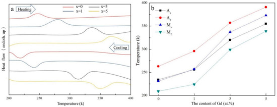 Generally, the application temperature of MSMA (i.e., Co-Ni-Al series) based on twin martensite boundary migration depends on the stable temperature of martensite. Therefore, it is necessary to promote the martensitic transformation temperature and broaden the stable temperature range of martensite. The martensitic transformation temperature (including the martensitic transformation start (Ms) or finish (Mf) temperature and the austenite transformation start (As) or finish (Af) temperature) of samples with Gd doping between 200~400 K were analyzed using the DSC test and the result is shown in Figure 3. From DSC curves (Figure 3a), only one endothermic and one exothermic peak is observed during heating and cooling processes, which is a typical characteristic of one-step phase transformation as temperature fluctuates. In Figure 3b, the phase transformation temperature of the sample without Gd doping (x = 0) is found to be at room temperature (Ms = 231 K, Mf = 209 K, As = 234 K and Af = 263 K). When a small amount of Gd is doped (x = 1), the phase transformation temperature increases apparently, especially the Ms and Af increase amplitude by more than 25 K (the Ms rises from 231 K to 257 K and the Af rises from 263 K to 296 K). Compared, the Mf and As had slightly increase amplitude (about 20 K, the Mf rises from 209 K to 224 K and the As rises from 234 K to 256 K). With increasing doping content (x = 3), the phase transformation temperature shows a clear increasing tendency, e.g., Ms rises to 337 K, Mf rises to 299 K, As rises to 320 K, and Af rises to 357 K. For further doping (x = 5), the tendency of phase transformation temperature increasing gradually flattened, e.g., Ms, Mf, As and Af, rises to 373 K, 339 K, 355 K and 391 K, respectively.