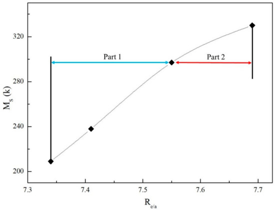 where is the atomic valence electron of element i and is the proportion of element i. For alloys, the atomic valence electron of Co, Ni, Al, and Gd is 9 (core+3d74s2), 10 (core+3d84s2), 3 (core+3s23p1), and 10 (core+4 f75d16s2), respectively. From Figure 4, it is obvious that the relationship between Re/a and the Ms is non-linear. The new relationship between Re/a and Ms can be described using the following Equation (3) [12]: