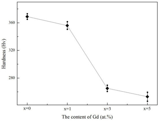 The HV2 (20 N as load) of the sample with Gd doping was shown in Figure 5. The Vickers hardness shows an “snake”-like decreases trend with Gd doping, i.e., the Vickers hardness value is 396, 356, 265 and 253 when Gd doping content is 0 at.%, 1 at.%, 3 at.%, and 5 at.%, respectively. According to the different decline trend, the hardness curves can be divided into three levels. (1) The first level: the hardness represents a slow decreasing trend when x = 1; (2) the second level: the hardness displays a rapid decreasing trend when x = 3; (3) the third level: the hardness shows a slow decreasing trend again when x = 5.