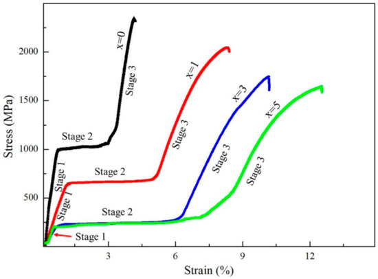 The stress-strain curves of the sample with Gd doping were obtained by compression tests and the results are shown in Figure 6. From the stress-strain curves, it can be said that the sample without Gd doping appears to have high yield strength (2274 MPa) and a worst ductility (4.2%). After a small amount of Gd doping (x = 1), the yield strength of the sample slightly decreases from 2274 MPa to 2012 MPa, however, the ductility improves from 4.2% to 8.7%. With more Gd doping (x = 3), the yield strength further decreases to 1813 MPa and the ductility significantly improves to 10.4%. When the content doping of Gd reaches 5 at.%, the yield strength of the sample decreases to 1630 MPa. The ductility of the sample increases further to 12.9%. It is interesting to note that the strain of sample with 3 and 5 at.% Gd doping shows a very slow growth and represents a platform in the stress-strain curves.