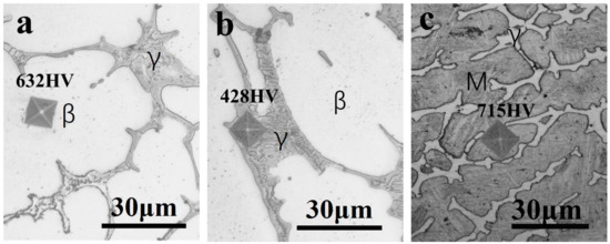 The micro-hardness of β phase (a), γ phase (b), and martensite (c) in the sample with 1 and 3 at.% Gd doping.