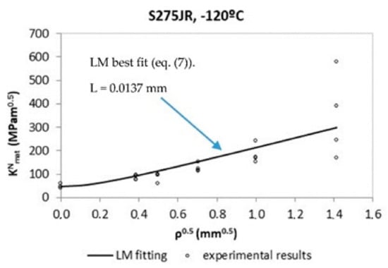 The fracture toughness tests (in cracked specimens) and the apparent fracture toughness tests (in notched specimens) were performed following ASTM1820 standard []; alternative experimental approaches can be found in literature (e.g., [,,,,]), whereas the L values of the four steels at the different temperatures (see Table 1) were calibrated by a least squares fitting of the experimental results. Figure 1 [,] shows an example corresponding to steel S275JR tested at −120 °C. σ0 values were directly obtained from Equation (2) once Kmat and L were known. The total number of tests is 394, with L values varying from 0.0028 mm up to 0.0198 mm. Thus, the experimental results collected here represent a wide range of situations.