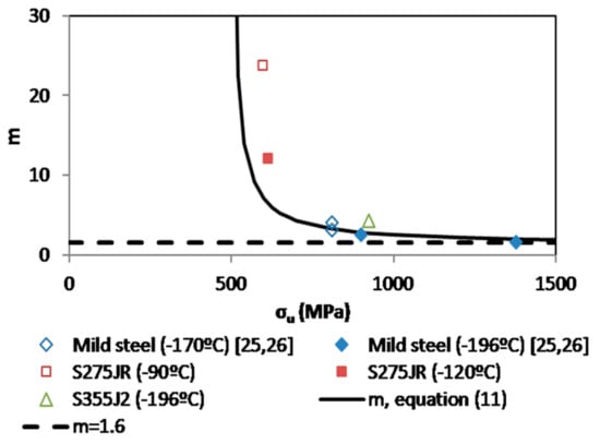 Figure 2 and Figure 3 show the experimental value of m for each material analyzed. It can be observed that Figure 2 includes additional data taken from the literature [,]. The values have to be analyzed separately in two different groups, attending to their different fracture behavior and mechanical properties: structural steels operating in LS conditions, and structural steels operating in the DBTZ.