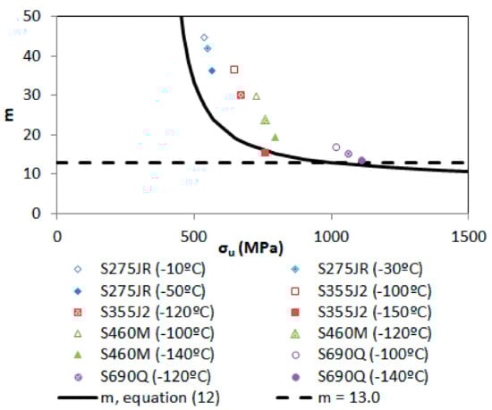 For structural steels operating in the DBTZ the lower bound value of m proposed in Reference [] was 13, as shown in Figure 3. This much higher correction is associated with a more non-linear behavior of the structural steels within the DBTZ when compared to the behavior of the same steels within the LS. Again, a fitting curve is provided with the aim of improving the accuracy of the predictions (σu in MPa):