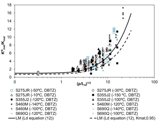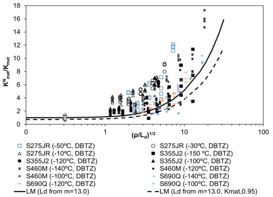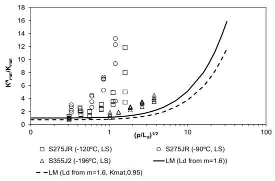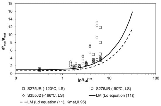 - The LM predictions derived from the proposed default values of the material critical distance (Ld) capture a significant part of the physics of the notch effect, given that the LM prediction adequately follows the tendency of the experimental results, which have been obtained for a wide variety of structural steels and conditions. The results are particularly accurate considering fitting Equations (11) and (12) and the average value of the material fracture toughness (Kmat) for each particular steel and working temperature. These fitting equations significantly reduce the conservatism obtained from the lower bound values proposed in [].