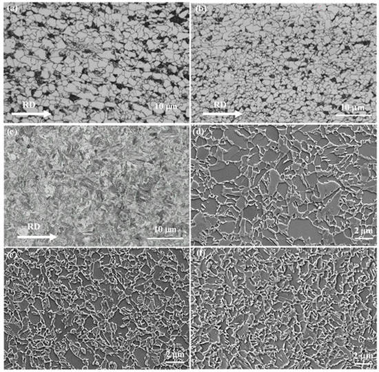 The resulting microstructure of samples is shown in Figure 1. After hot rolling and air cooling, the CHR-Q&P steel and AHR-Q&P steel both showed a typical ferrite and pearlite microstructure, as shown in Figure 1a,b. In the CHR-Q&P steel, pearlite banding was observed parallel to the rolling direction (RD), but in the AHR-Q&P steel, the pearlite banding was broken and was present in a non-continuous manner. AHR refined the grain size. After AHR and DQ, the as-direct quenched microstructure of AHR-DQ-Q&P steel is shown in Figure 1c, which exhibits a typical martensitic microstructure. Resulting final microstructure of subsequent Q&P process are shown in Figure 1d–f. In the SEM micrographs, ferrite appears black, while martensite appears light grey. It is difficult to make a clear distinction between RA and matrix in the SEM micrographs. The microstructural constituent consisted of equiaxed grains of intercritical ferrite surrounded by martensite and RA. In contrast, as is shown in Figure 1d–f, the average ferrite grain size of the three samples are about 3.5 μm, 1.2 μm and 0.8 μm, respectively. The best refined microstructure was present in AHR-DQ-Q&P steel, followed by AHR-Q&P steel and CHR-Q&P steel.