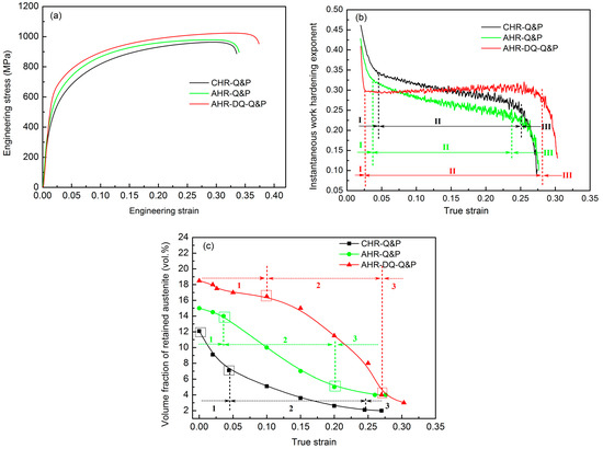Engineering stress-strain curves of samples at room temperature (a), variation in instantaneous work-hardening exponents with true strain (b) and volume fraction of retained austenite as a function of engineering strain (c) for CHR-Q&P, AHR-Q&P and AHR-DQ-Q&P steel.