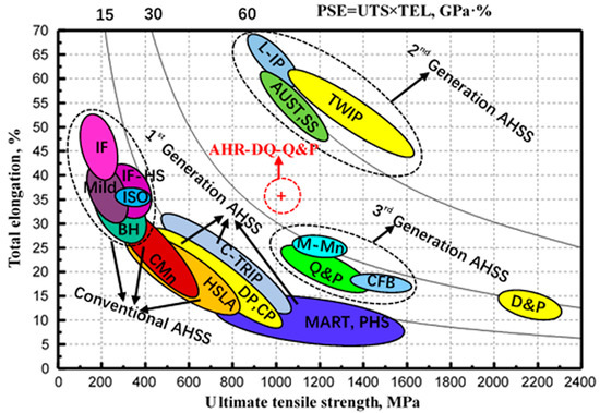 We compared the mechanical performance of AHR-DQ-Q&P steel to other advanced high strength steels (AHSS) in literature [36,37,38,39] in Figure 4. By AHR and subsequent DQ prior to Q&P process, AHR-DQ-Q&P steel not only exhibited significantly higher PSE than conventional AHSS, but also exhibited significantly higher UTS and larger TEL than other convectional TRIP (C-TRIP) steel, dual phase (DP) steel and complex phase (CP) steel in the region of the first generation AHSS. Moreover, it exhibited higher TEL than medium Mn (M-Mn) steel, Q&P steel and carbide-free bainite (CFB) steel in the region of the third-generation AHSS. Simultaneously, it exhibited slightly higher PSE than deformed and partitioned (D&P) steel [39]. Although its PSE is lower than that of the third-generation steel mainly including twinning-induced plasticity (TWIP) steels, its weight fraction of alloying element is decreased, and the price is relatively cheap. Consequently, our AHR-DQ-Q&P steel achieves excellent tensile properties and defined a new region above the PSE line of 30 GPa% in the strength-ductility map (Figure 4). Not only tensile strength of ~1000 MPa, the excellent PSE of ~35 GPa% in our AHR-DQ-Q&P steel makes it a desirable alloy for applications where PSE is the main design criterion, which is rather remarkable for a low-alloy steel.