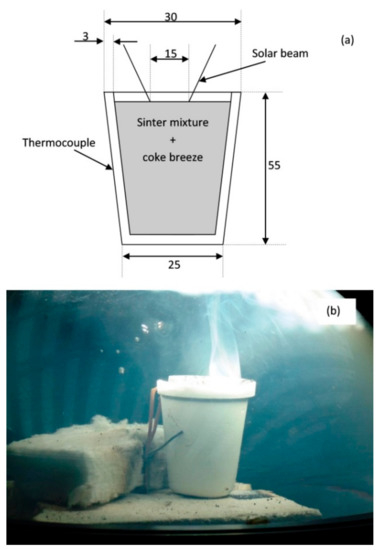 Experiments were performed in a 1.5 kW vertical axis solar furnace located in Odeillo (France) and belonging to the Centre National de la Recherche Scientifique (PROMES-CNRS). This solar furnace has a heliostat that tracks sunlight and directs it towards a parabolic concentrator of 2.0 m in diameter (Figure 1). The parabolic concentrator makes radiation converge in a focal point of 15 mm in diameter. The maximum concentration that can be reached is 15,000 times the incident radiation. Mixtures were loaded in tabular alumina crucibles (55 mm height, 30 mm upper diameter, 25 mm lower diameter, and 3 mm in thickness) that were located below the focal point (see Figure 2a). The duration of the experiments varied between 12 and 20 min, depending on the sample. The sample was held below the focal point throughout the experiment. Tests were performed under air atmosphere. However, a glass hood connected to a pump was used to catch gases and particles released during the experiments, which otherwise could become adhered to the parabolic concentrator (Figure 2b). The same mixtures were used in the five experiments, with the purpose of reproducibility. Mixtures were prepared with sinter mixture (sinter feed Voestalpine, see Table 1, d50 < 2 mm) and 2 mass % of coke breeze (see Table 2, d50 < 1 mm). They were manually mixed and homogenized, and then mixtures were charged into the crucible. The Voestalpine sinter feed, the same as the coke breeze, is that used in the industrial iron ore sintering process in the Dwight-Lloyd machine (but we only used the fine granulometric fraction). However, the sinter mixture was not granulated in our experiments, as fluid-dynamics (solid-gas interaction) did not require it.