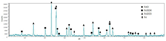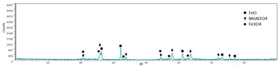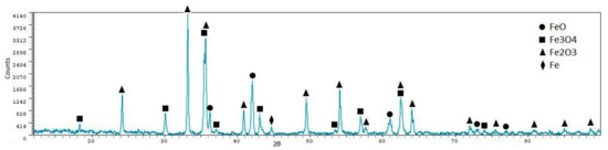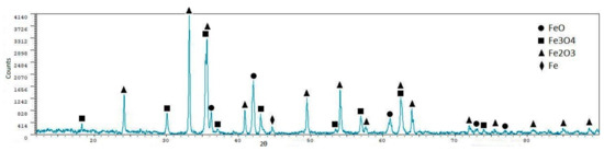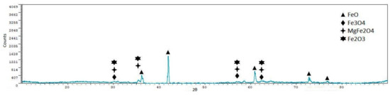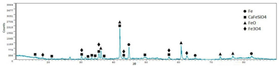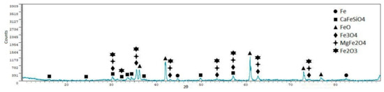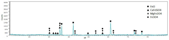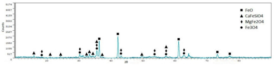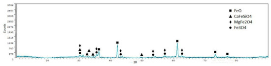 From the X-ray diffraction analyses, we can see that iron oxides (FeO and Fe3O4) are the most representative phases, as expected. Silicoferrites of calcium (but also aluminates and ferrites) are also available in the samples. A quantitative analysis of the crystalline phases was performed using the software XPowder12 Ver. 01.02. The results are shown in Table 5.