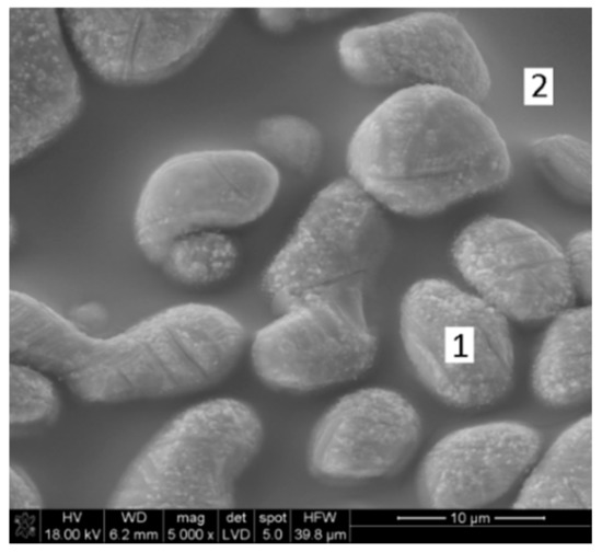 Samples were also observed with the electronic microscope, with the possibility of performing point analysis. Figure 8 shows a representative image of the solar sintered samples, where point 1 (disperse constituent) corresponds to the iron rich phase (Table 6), while point 2 (matrix constituent) belongs to the silicoferrites of calcium and aluminum (Table 6). In Figure 9, it is possible to see, at lower magnification, the structure shown in Figure 8. Figure 9 shows that the process develops in a larger extent and not only locally.