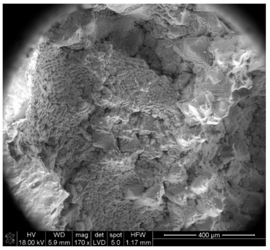 Points 1 and 3 represent the iron rich phase obtained via solar; the presence of Mg, Al, Si, and Ca could indicate drags of slag. Regarding Point 2, it might belong to Fe3O4 (we see the typical structure of the magnetite), but with significant quantities of aluminum (maybe as oxide). With lower magnification we see in Figure 24 the aspect of the sample BF1, where we see that the zones with shape similar to Points 1 and 3 occupy most of the image.
