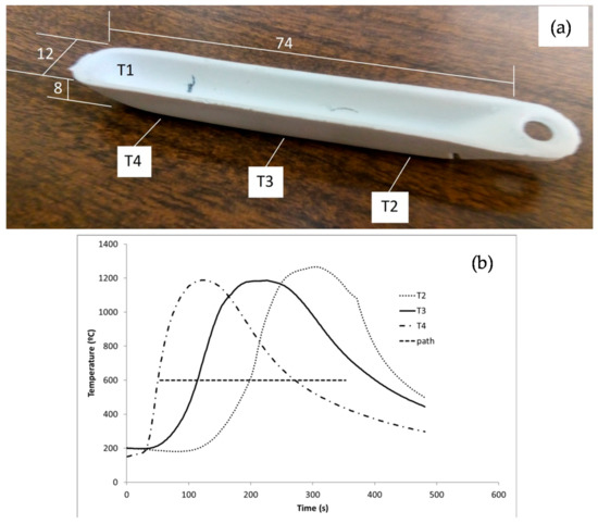(a) Image of the crucible used in the experiments, distances in millimeters. Position of the thermocouples: T1 located inside of the crucible, T2, T3, and T4 located outside at the bottom of the crucible; (b) measurements of the thermocouples for a sample treated with concentrated solar energy.