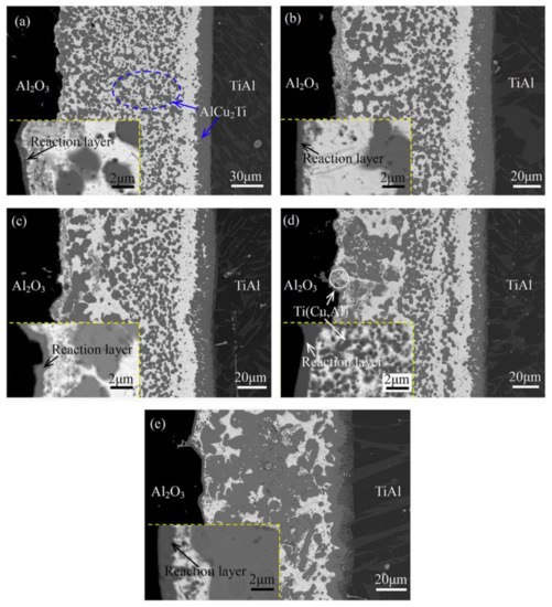 Microstructure of the TiAl/Al2O3 joint brazed at 880 °C for 10 min with different Ti contents: (a) 0, (b) 2, (c) 4, (d) 6 and (e) 8 wt%, reproduced from Reference [23] with permission of Elsevier, 2016.