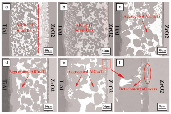 Feng et al. [27] investigated the microstructure evolution and mechanical properties of brazed TiAl and ZrO2 joints using Ag-Cu filler metal. The brazing experiments were carried out between 860 and 940 °C for 5 to 30 min under vacuum. The higher shear strength value was observed for the joints produced at 880 °C for 10 min. The representative interfacial structure of the TiAl/ZrO2 joint was TiAl alloy/γ-TiAl/AlCuTi/AlCu2Ti/(Ag)+AlCu2Ti+AlCu4/Cu3Ti3O+TiO/ZrO ceramic. Brazing temperature had a strong influence on the microstructure evolution and shear strength of TiAl/ZrO2 joints. With the brazing temperature increasing, the thickness of the reaction zone adjacent to the TiAl base material and reaction layers next to the ZrO2 ceramic increased obviously, as seen in Figure 6. In addition, an aggregated AlCu2Ti phase distribution is observed at the center of the brazing interface produced at 940 °C. These microstructural changes result in a drastic deterioration of the mechanical properties of the joint.