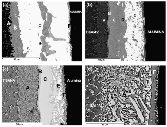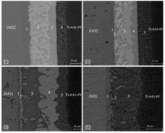 SEM images of Ti6Al4V/Al2O3 interface microstructure at bonding temperature of 750 °C for: (a) 10 min; (b) 20 min; (c) 30 min; (d) 60 min, reproduced from Reference [48] with permission of Elsevier, 2009.