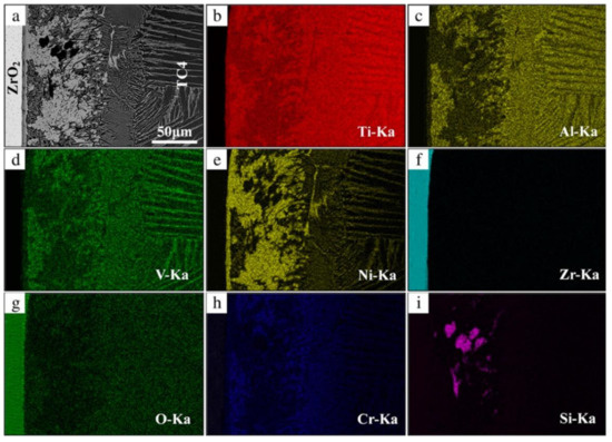 Interfacial morphology and elemental distribution of Ti6Al4V and ZrO2 joint brazed at 1000 °C for 10 min. (a) SEM image of the joint and EDS elemental maps distribution images of (b) Ti, (c) Al, (d) V, (e) Ni, (f) Zr, (g) O, (h) Cr, (i) Si, reproduced from Reference [35] with permission of Elsevier, 2013.