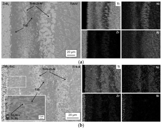 SEM images and EDS elemental maps distribution images of (a) Ti6Al4V/NiB50/ZrB2 and (b) Ti6Al4V/NiB50/ZrB2-SiC joints, reproduced from Reference [37] with permission of Springer, 2014.