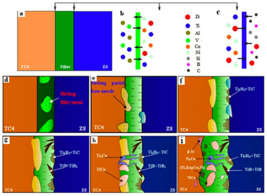 Schematic of the formation of each reaction layer during the brazing process: (a–c) show the interaction between filler and base metal; (d) the filler begins to melt; (e) the molten brazing alloy wetted the surface of base metals; (f) the formation of Ti5Si3 and TiC; (g) the formation of TiB and TiB2; (h) the formation of Ti2Cu and TiCu; (i) the formation of (Ti,Zr)2(Cu,Ni) and β-Ti during the cooling process, reproduced from Reference [39] with permission of Elsevier, 2017.