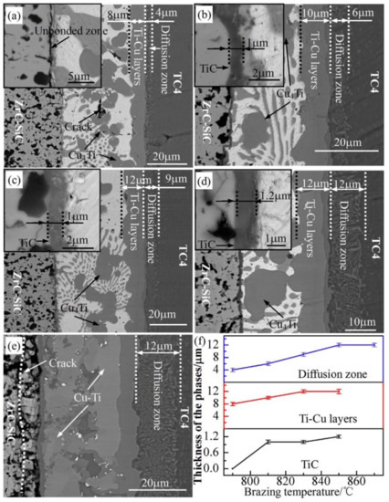 ZrC-SiC is another ultra high temperature ceramic that, due to the outstanding properties, is an ideal candidate for structural applications, such as rocket engines, structural components or diffusion barriers in the nuclear industry. However, the joining of this ceramic to metallic parts is essential for the implementation in these sectors. The dissimilar joining with titanium alloys seems to be an extremely attractive approach for its wide applications. Shi et al. [40] used a commercial AgCuTi braze alloy to obtain Ti6Al4V/ZrC-SiC joints. The assembly of the base materials and braze alloy was heated using several temperatures from 790 to 870 °C, for times between 1 to 15 min under a pressure of 600 kPa. The bonding on the Ti6Al4V was ensured by the reaction between the liquid braze alloy with this base material forming Cu-Ti and a diffusion layer. On the side of the ceramic material, the formation of Ti3SiC2 and TiC phases are observed due to the Ti diffusion across the interface. The temperature and time of the joining process have a substantial influence on the microstructure of the interface. Figure 15 shows the microstructure evolution of the interface with the temperature. The thickness of the layers increases with raising of the brazing temperature, as well as induces the formation and size of Cu-Ti compounds. The maximum shear strength value of 39 MPa was observed for the joint produced at 810 °C for 5 min.