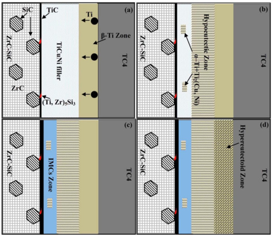 Microstructural evolution model of the Ti6Al4V(TC4)/ZrC-SiC brazed joints: (a) Formation of TiC and β-Ti zone, (b) formation of the hypoeutectic zone, (c) formation of intermetallic compounds (IMCs) zone, (d) transformation of the β-Ti zone to hypereutectoid zone, reproduced from Reference [41] with permission of Elsevier, 2018.