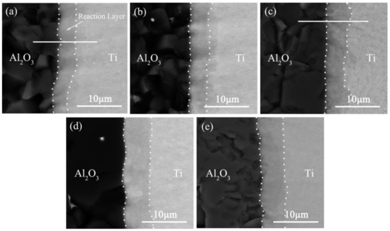 The microstructures of Ti/Al2O3 joints diffusion bonded at 900 °C for 120 min under different voltages: (a) 0 V; (b) 300 V; (c) 700 V; (d) 1100 V; (e) 1500 V, reproduced from Reference [46] with permission of Elsevier, 2015.