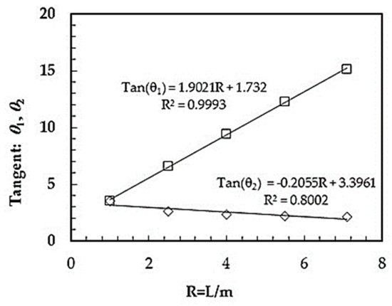 The straight-lines in Figure 10 pass through the origin of the axes as indicated by Equation (4) (independently of the indenter geometry, curves match for E, i.e., for materials with rigid-plastic behaviour, which corresponds to the ratio ). The factor is evaluated from the slope, , of the straight line, related with through . Using this procedure, for the values of the R-ratio of 1, 2.5, 4, 5.5, and 7.11, the correction factor obtained were 1.054, 1.141, 1.232, 1.351, and 1.473, respectively. The value of 1.473 for the Knoop indenter is very close to that mentioned above (1.469), obtained from the ratios (Figure 9b).