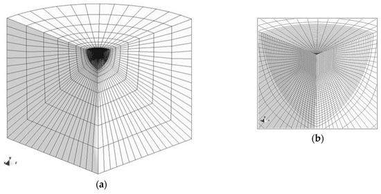 The test sample used in the numerical simulations has both radius and thickness equal to 40 µm. Its discretization was performed using three-linear eight-node isoparametric hexahedrons. Due to geometrical and material symmetries in the X = 0 and Z = 0 planes, only a quarter of the sample was used in the numerical simulation, as shown in Figure 4.