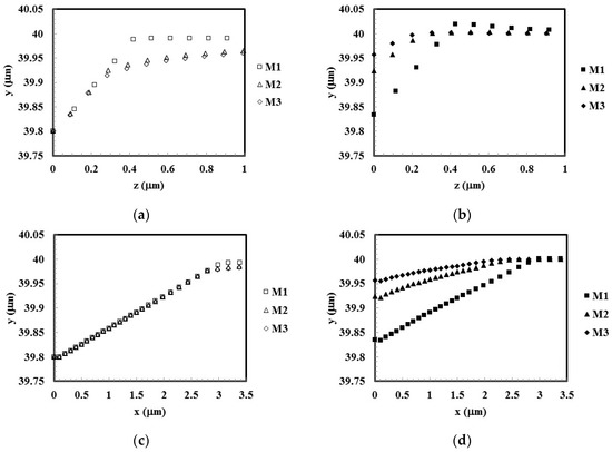 After unloading, the indentation profiles corresponding to the materials M2 and M3 shown elastic recovery in both diagonals (Figure 5b,d). Moreover, the amount of elastic recover increases with the decrease of the ratio . In case of M1 material, with a ratio and without strain hardening, the indentation profile along the short diagonal shows pile-up (Figure 5b). In fact, for other indenter geometries (conical and Vickers), the pile-up appears for values of the ratio higher than 0.8 in materials without strain hardening (see, e.g., [22,30]). It should be noted that, for a given material, the ratio correlates with the value of the H ratio between the hardness and the Young’s modulus, and slightly depends on the strain hardening parameter.
